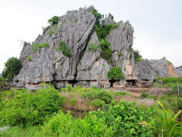 Đến với núi đá dựng là đến với sự kì vĩ, thần bí của những hang động, những nhũ đá thiên nhiên. Du khách có thể bắt đầu cuộc hành trình khám phá Núi đá dựng với một cây đèn pin nho nhỏ. Núi đá dựng bao gồm nhiều hang động khác nhau, mỗi hang động đều mang trong mình một vẻ đẹp riêng biệt: Hang Dơi có thạch nhũ hình bầu hồ lô; hang Thần Kim Quy có khối đá xanh, dẹt dẹt như hình con rùa thần; động Bồng Lai chinh phục bởi không khí trong lành như chốn tiên; động Khổ Qua thì nuôi dưỡng những nhũ đá kì thú mang hình trái khổ qua khổng lồ,…